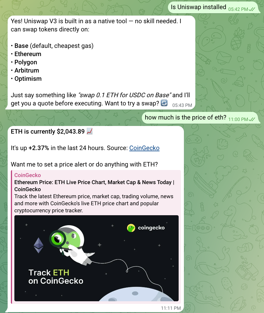 The agent cannot bypass or disable any layer. Security lives outside the bot.